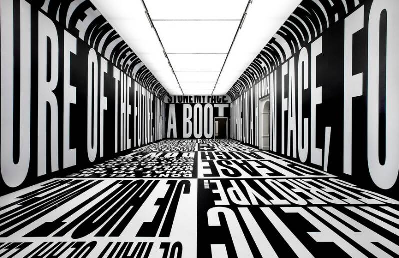 Der Einsatz überdimensionaler Typografie in großzügigen Hallen und raumhohen Räumen lässt den Text mit der Architektur verschmelzen. Krugers Texte bedecken Böden wie Fliesen, überziehen Wände wie Farbe; sie wirken nicht fehl am Platz, sondern sind fest im Raum verankert, als hätten sie schon immer dort existiert. Wenn Schrift nicht mehr nur an der Wand hängt, sondern selbst zur Wand wird, übernimmt sie eine architektonische Funktion.