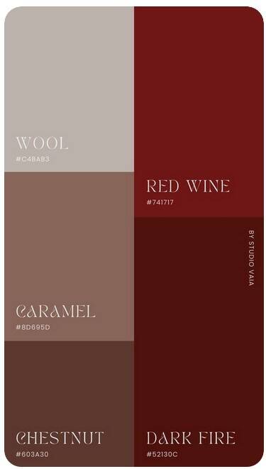 Erdige Farbtöne wie Braun, Olivgrün und Naturtöne sorgen in Kombination mit Dunkelkirschrot für Wärme und Tiefe.