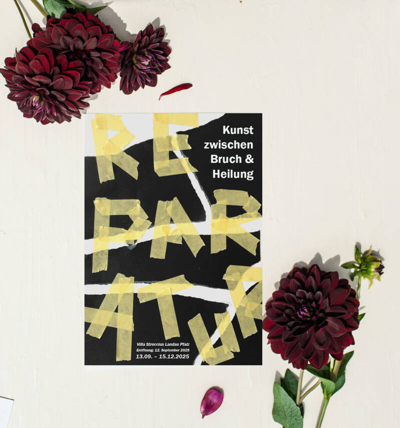 Dieses Plakat ist eine Werbung für eine Kunstausstellung mit dem Titel „Reparatur – Kunst zwischen Bruch & Heilung“. Das Design ist mutig, roh und ausdrucksstark. Rau gezerrissene Kanten, starker Schwarz-Weiß-Kontrast und gelbe Klebeband-Typografie spiegeln die Themen von Schaden und Reparatur wider.