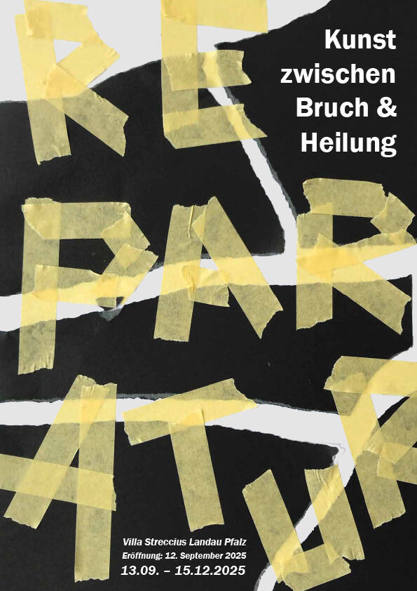 Der Schwarz-Weiß-Hintergrund bildet einen starken Kontrast zur gelben Klebeband-Typografie und erzeugt eine visuelle Spannung, die das Thema der Ausstellung aufgreift.